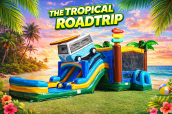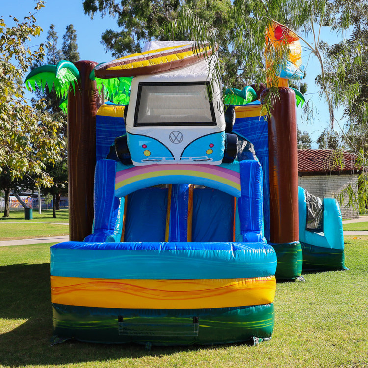 Say "Aloha" to the perfect party centerpiece! This vibrant 3-in-1 combo brings the spirit of the islands right to your backyard. Kids can jump in the spacious bounce house, climb past the tropical palm trees, and take a thrilling ride down the dual-lane slide—all beneath a classic retro surf van perched right on top. With colorful signage pointing the way to Lahaina, Hana, and Kihei, it’s not just a bounce house; it’s a Hawaiian vacation on wheels.